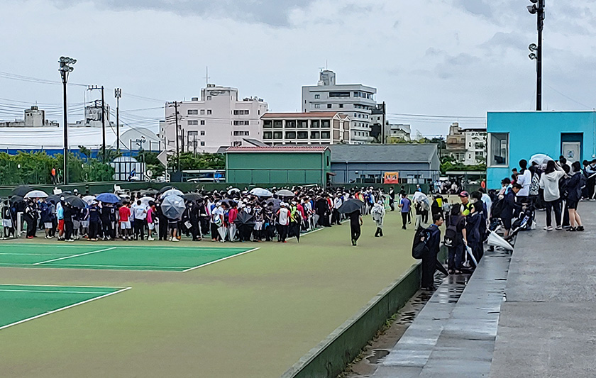雨の中の開会式。関東予選個人戦でベスト64に残ったペアと各学校から監督推薦として1ペアが参加できる、インハイ予選個人戦に154ペアが出場しました。