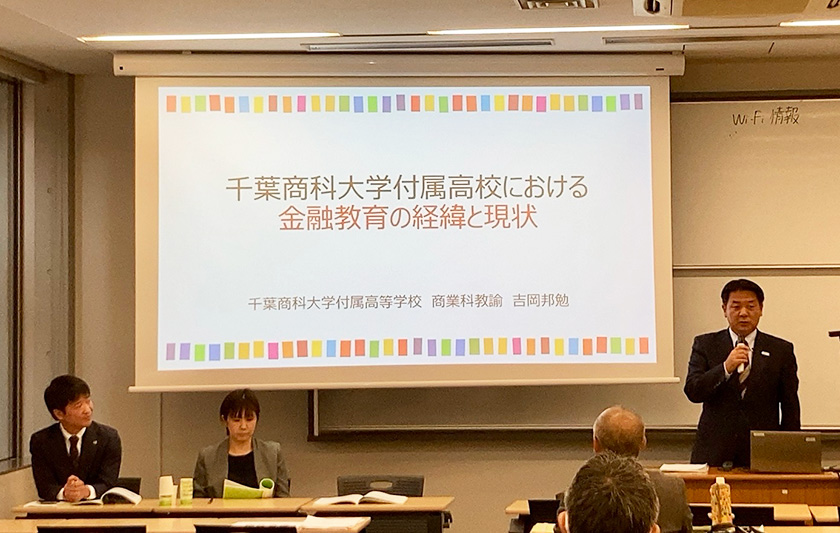 学会では、千葉商科大学との高大一貫教育プログラムを基にした「高大連携金融教育の展望と課題」に関するパネルディスカッションを行い、本校で金融リテラシー教育を担当している吉岡教諭と森田教諭、千葉商科大学人間社会学部の伊藤宏一教授及び、本校の金融リテラシー教育を支援されている日本FP協会パーソナルファイナンス教育インストラクターの髙島健氏が登壇しました。