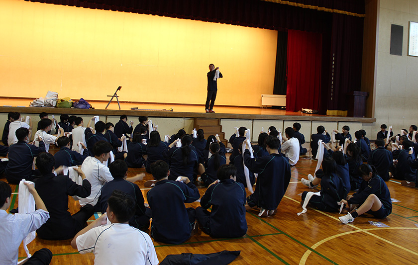 講義の後は、三角巾を使った応急処置法・シーツを使っての搬送法・キットを使っての心肺蘇生法などを実際にグループやペアになって体験しました。講師の先生の的確な解説と、時にユーモアのある解説が相まって、各会参加する生徒たちは真剣に講義に聞き入っていました。また実技にも真剣に取り組んでいました。