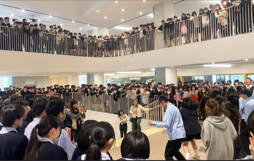 その後、校舎2階の吹き抜けスペースで中壢家事商業高級中等学校の生徒10名によるダンスパフォーマンスが披露され、一目見ようと集まった大勢の生徒と一緒に盛り上がりました。