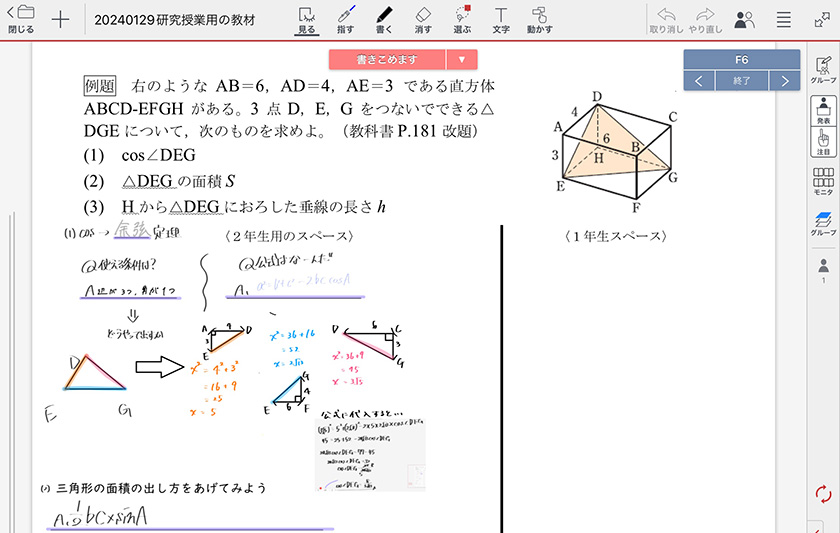 授業は、2教室をオンラインでつなぎながら行いました。1・2年生合同のグループに分かれ、自己紹介後に2年生が1年生に例題の解法を説明し、演習問題に取り組みました。2年生は、“教える”ために説明方法を工夫し、準備を進めてきました。1年生は、普段接する機会が少ない先輩との交流だったため、緊張している姿が見られました。