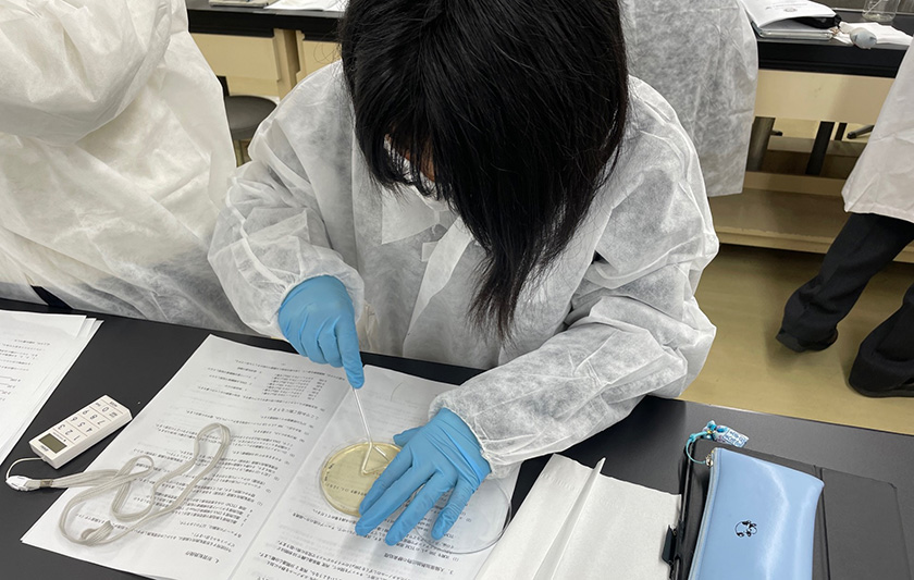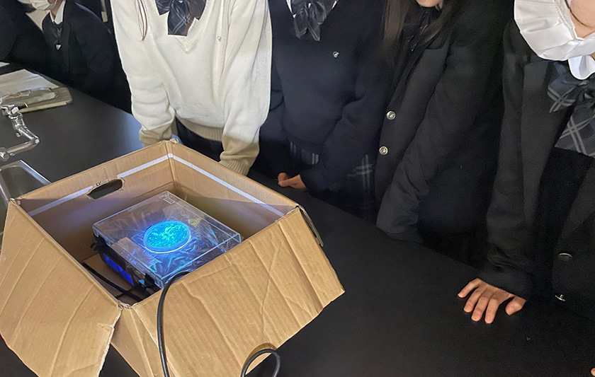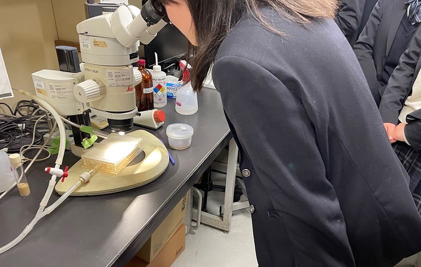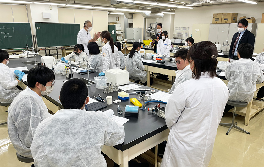 この実験は高校の生物基礎および生物で学ぶことですが、この実験を高校生が行うことはなかなかできないと教授が話されていました。生徒は机上の理論だけではなく、実際の現象を観察し理解することで、生物への興味や関心をより深めることができました。また、キャンパスツアーにおいて、実験で扱った蛍光タンパク質や抗生物質耐性の大腸菌が、実際に研究に使われている様子も見学させていただき、非常に有意義な高大連携実験講座となりました。