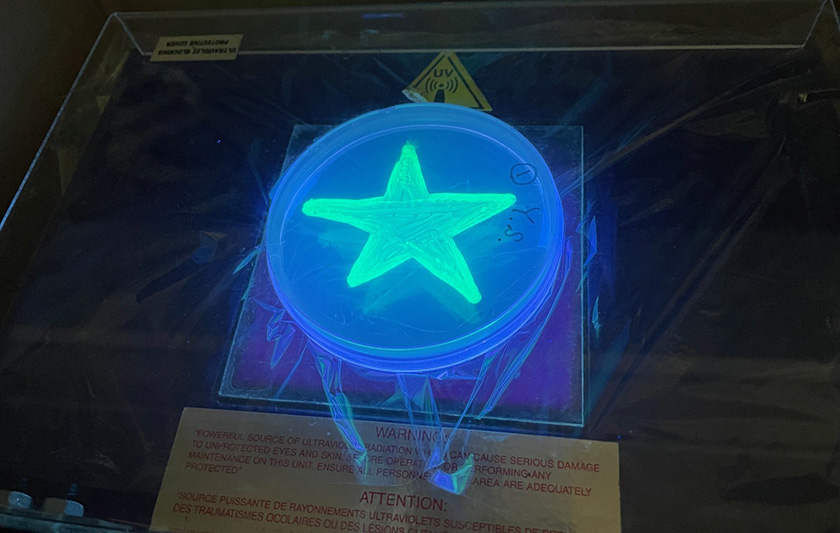 今回の高大連携実験講座のテーマは「大腸菌の形質転換系を用いた遺伝物質の同定」で、抗生物質耐性の大腸菌を加熱処理し、その抽出液を、タンパク質分解酵素およびDNA分解酵素で処理し、抗生物質感受性の大腸菌と混合して、抗生物質耐性へと形質転換(遺伝的な性質が変わること)するかどうかを調べました。これにより、遺伝物質がタンパク質であるのか、DNAであるのかを同定しました。また、抗生物質耐性の大腸菌は、蛍光タンパク質を生成する形質も持っており、その形質も受け継がれたことも観察しました。