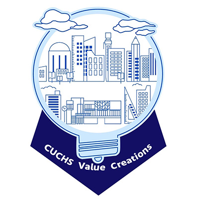 アイデアやひらめきを表現している電球の中に、地域活性化の願いを込めて、千葉商大付属の校舎と地域の街並みがデザインされています。