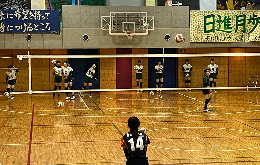 序盤にスパイクやサーブのミスが出て自分たちの流れを作れない状況でしたが、相手のミスもありながら自分たちの流れを作ることができ、2対0で勝利しました。次の試合は日出学園と対戦しました。この試合は終始こちらのペースで試合を進め、サーブで崩してチャンスボールをもらって得点していくという流れを作り、2対0で勝利しました。