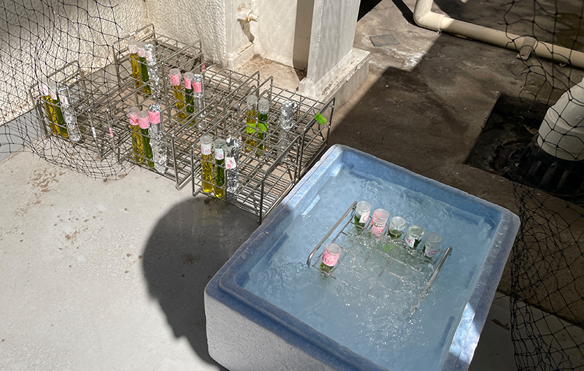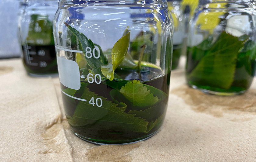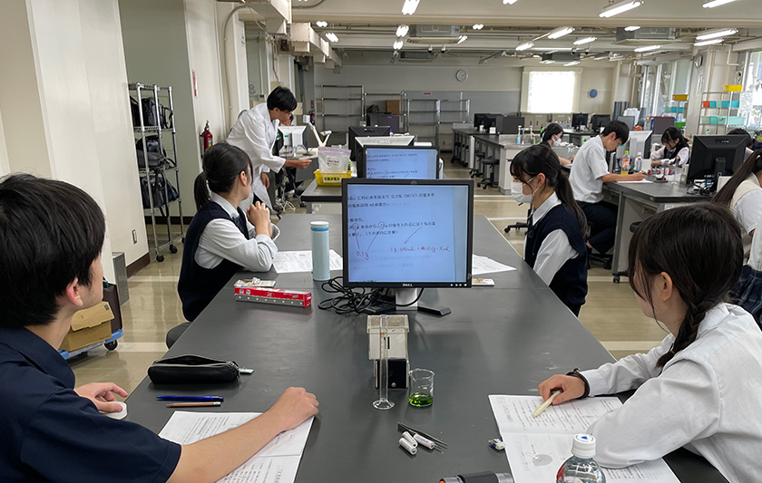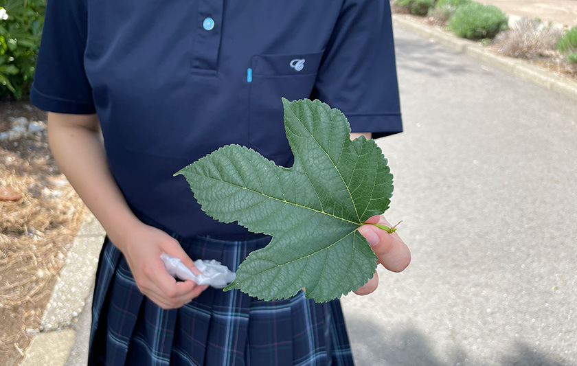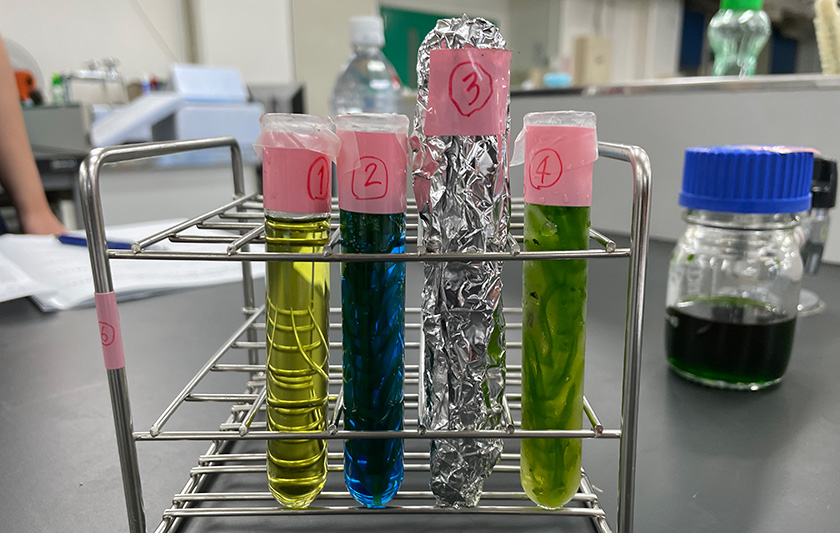実験では、藻類のオオカナダモを用いてさまざまな条件の下で光合成を行わせ、光合成が起こる条件を考察しました。また、東邦大学のキャンパス内に生えている植物から、グループごとに好きな葉っぱを採取し、光合成色素の抽出を行いました。用意された材料ではなく、自分たちで採取したものを実験で用いたことで、生徒の生物に対する興味・関心を深めることができました。