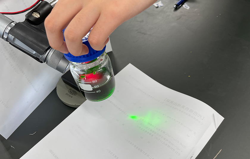 今回の高大連携実験講座のテーマは「光合成」で、光合成は光と温度の影響を受けることや、光合成色素の吸収する光の色と光エネルギー伝達について学びました。また、大学の入学試験で頻出の「対照実験」についての考え方についても学びました。