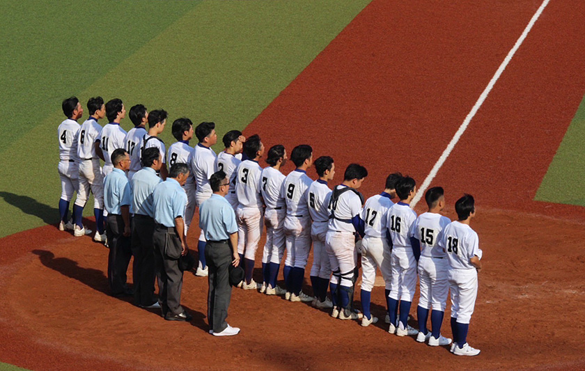 本校主将による選手宣誓から始まったこの大会、初戦は両チームに足がつる選手もいるような試合となりましたが、硬式野球部を始めとした大応援団の声援を受け勝利を収めることができました。