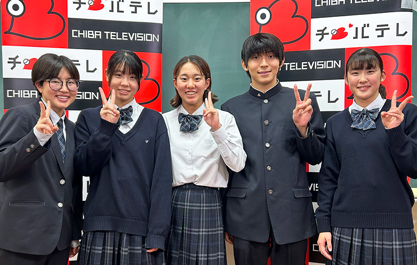 先日、千葉テレビの「モーニングこんぱす」という情報番組内の「ヒーローインタビュー」のコーナーの取材を本校水泳部5名が受けました。