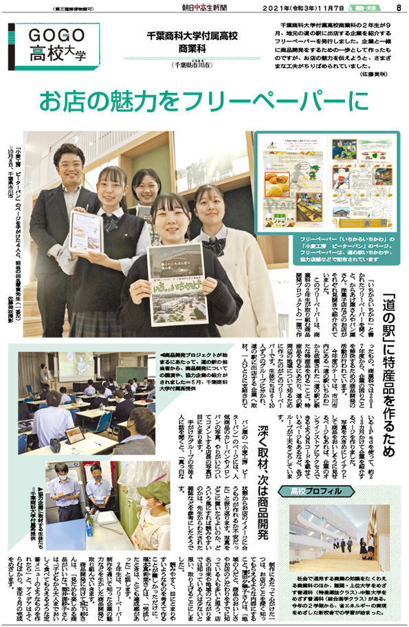 2021.11.16 在校生 2年生 [商業科] 商品開発フリーペーパー制作が新聞に掲載されました 朝日中高生新聞に商品開発プロジェクトの生徒たちが制作したフリーペーパー『いちからいちかわ』の刊行が紹介され、生徒のコメントが掲載されました。【掲載紙】朝日中高生新聞(2021年11月7日掲載)関連リンク[商業科] 商品開発フリーペーパー制作が新聞に掲載されました[商業科] 商品開発企業紹介フリーペーパーを制作しました[商業科] 商品開発協力企業へ取材を行いました[商業科] 商品開発講演会を行いました