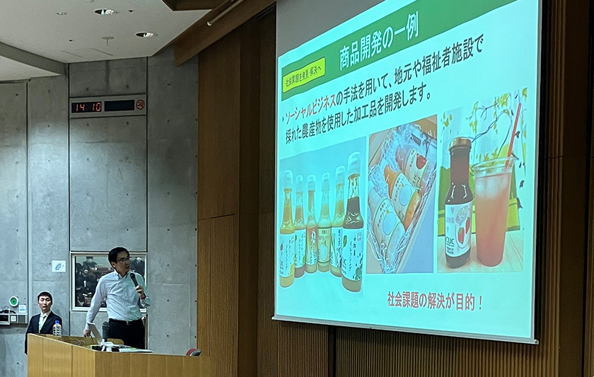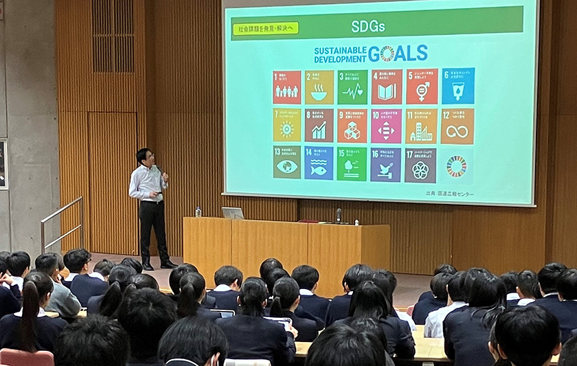 今回の大学での講義は人間社会学部の勅使河原教諭がSDGsについてやゼミで行っている「商品開発を通じての社会課題を解決する」取り組みについて講義していただきました。この講義が今後の総合探究の授業の充実につながることを期待しています。
