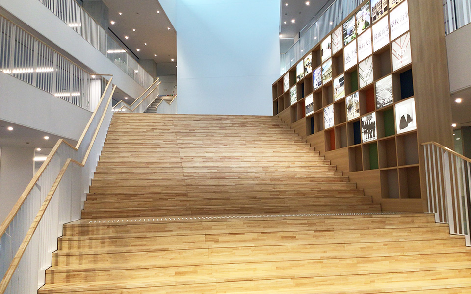 本館のシンボル「大階段」。階段横の展示ウォールは、新校舎スクールプロジェクトで出されたアイデアを元にデザインされ、高校の歴史を伝える写真が展示されています。