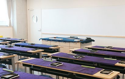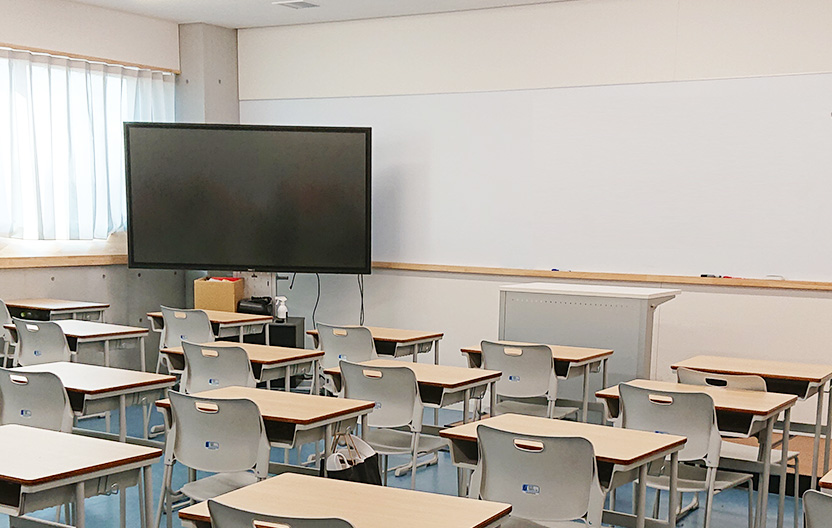 黒板の代わりにスクリーンにもなるホワイトボードを設置した、明るい教室。軽い椅子と机は生徒にも好評です。